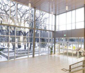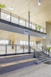 The new building construction is a 3 storey concrete and steel structure. There is a mix of concrete masonry units, structural steel/Delta beams, hollow core planks and conventional steel stud framing which make up the majority of the wall and floor structures. The piles are precast driven, with some cast in place piles for the exterior concrete stairs and ramp. There is a hydraulic elevator in the new construction, which will service the existing building floors as well. The finished space in the new building consists of a mix of classrooms, study spaces, as well as a new open common area which is being utilized as flex space by the school.